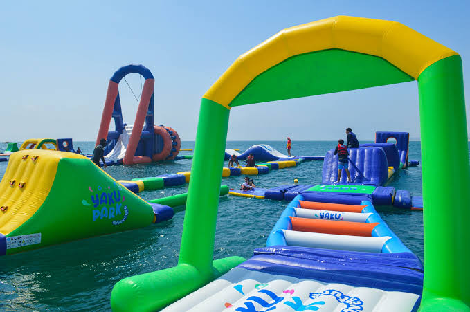 Disfruta del parque acuático inflable en el mar con saltos, escaladas y juegos para toda la familia.